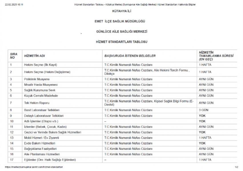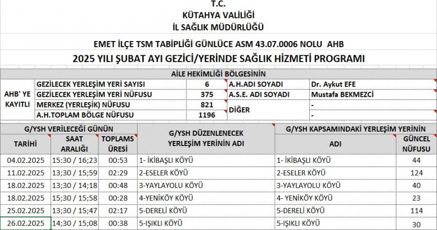 Verilen hizmetler arasında: Muayene, düzenli kullanılan ilaçların yazılması, laboratuvar, aile planlaması hizmetleri, gebe takibi, bebek takibi, aşılama, acil müdahele, enjeksiyon, pansuman vb. hizmetler yer almaktadır.
